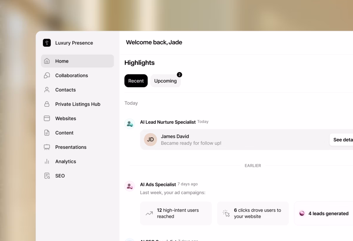 The era of juggling prompts, dashboards, and “AI assistants” is already behind us. AI is no longer just powering your tools. It is the team. With Luxury Presence, your marketing doesn’t wait on input or direction. It gets done.