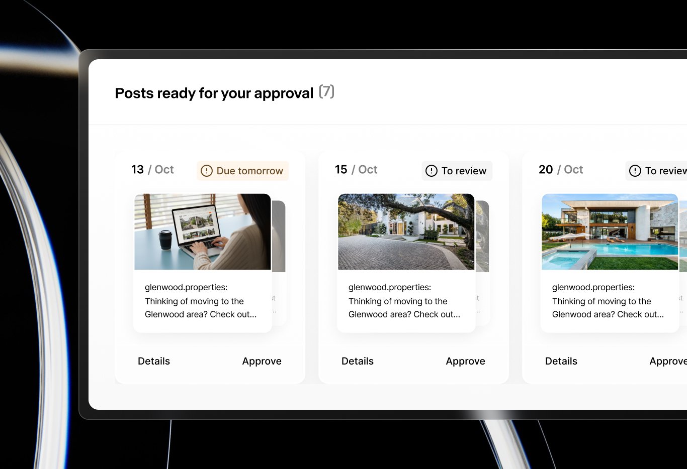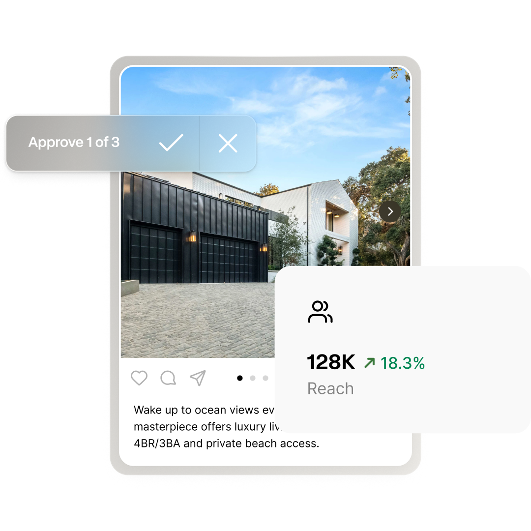 We deliver two to three on-brand posts per week across Instagram and Facebook, drafted from your listings and brand profile. Everything is ready for your review before anything publishes.