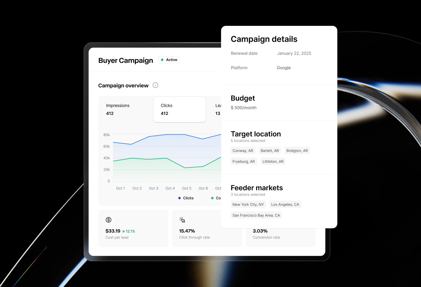 Hyperlocal ads on Google for buyer and homeowner leads. Listing ads on Meta with branded seller reports. Retargeting to keep your sphere warm. Your budget, no management fees, real-time reporting.